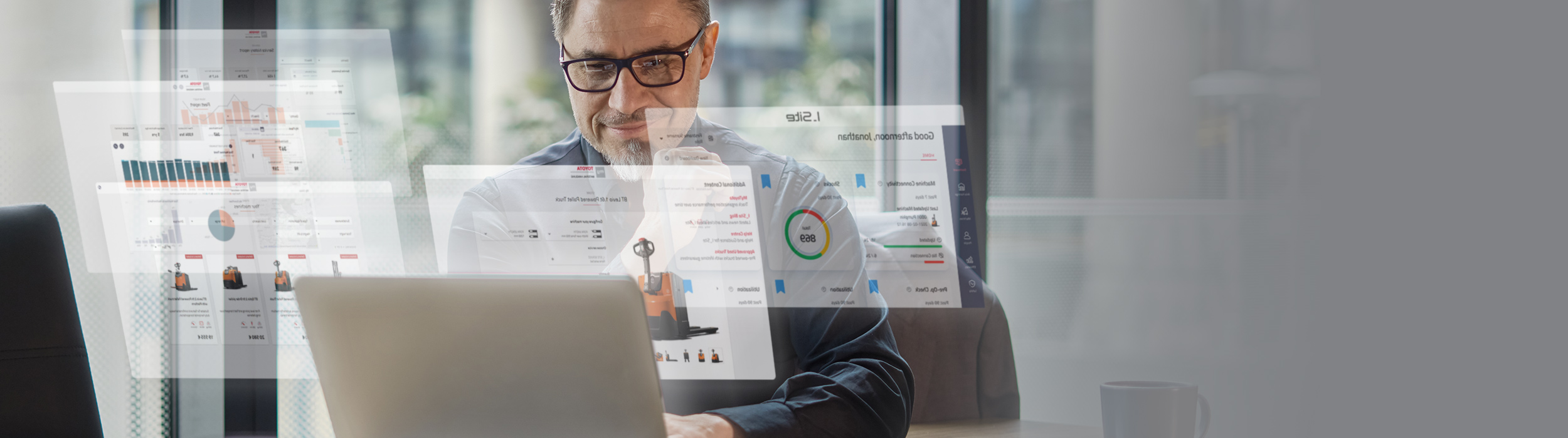 Im Kundenportal My Toyota Material Handling können Sie umfangreiche Flottenberichte zu Kosten, Service, Auslastung und mehr einsehen, um ihre Strategie auf Makroebene zu unterstützen. Übersichtlich aufbereitete I_Site-Daten Ihrer Gegengewichtsstapler oder Lagertechnikgeräte ermöglichen Ihnen strategische Übersichten in Bereichen wie Batteriehandhabung, Zugangskontrolle oder Impact Management, die Sie im I_Site Portal weiterverfolgen können. Außerdem besteht die Möglichkeit, Ihnen einen individuellen Store-Bereich einzurichten, der auf die mit uns vereinbarten Bedingungen zugeschnitten ist und Ihren Einkaufsprozess unterstützen kann.