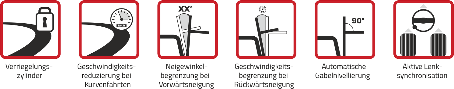 SAS schützt sowohl die Last als auch den Stapler vor einem gefährlichen Kippen nach vorne. Die Neigewinkelbegrenzung bei Vorwärtsneigung überwacht die Lasthöhe und die Position des Hubgerüsts. Wenn nötig, reduziert es zum Schutz von Fahrer und Last automatisch den Neigewinkel des Hubgerüsts. Dies vermindert das Risiko von Verletzungen und Sachschäden und ermöglicht niedrigere Versicherungskosten.